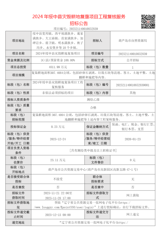 2024年绥中县灾毁耕地复垦项目工程复核服务