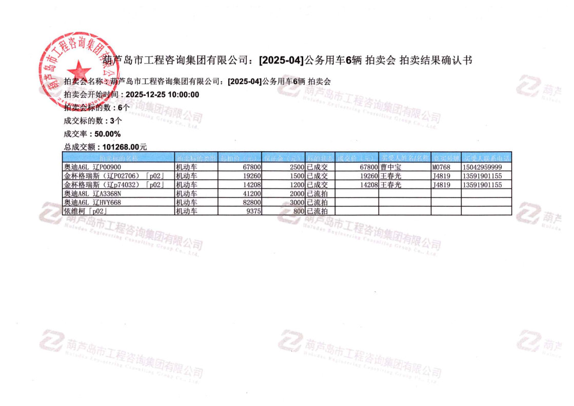 葫芦岛市工程咨询集团有限公司:[2025-04]公务用车6辆拍卖会 结果公示